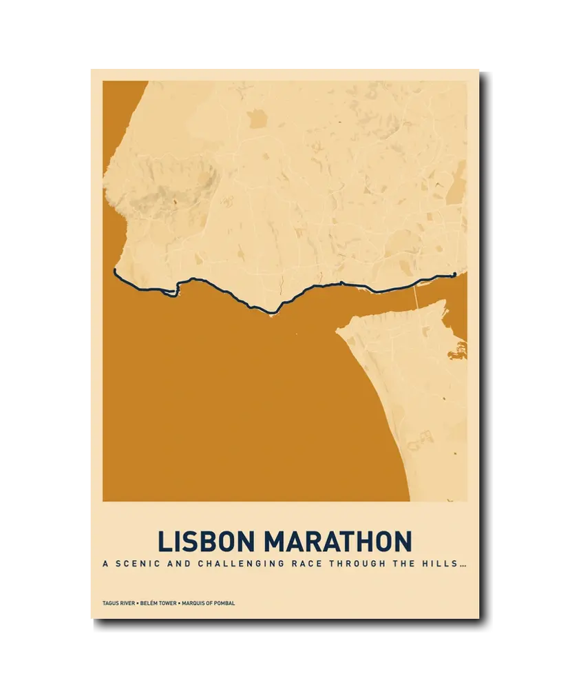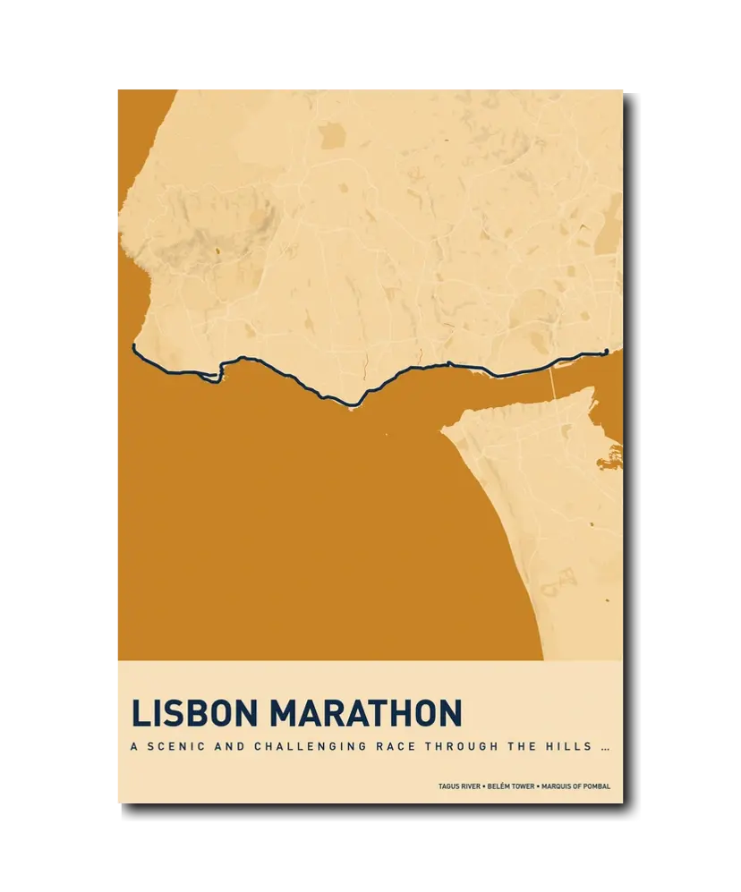 Lisbon is a city that will capture your heart — its golden light, stunning river views, and warm people make it one of Europe's most unforgettable marathon destinations. Let makemap help you commemorate your achievement with a beautiful custom map poster.